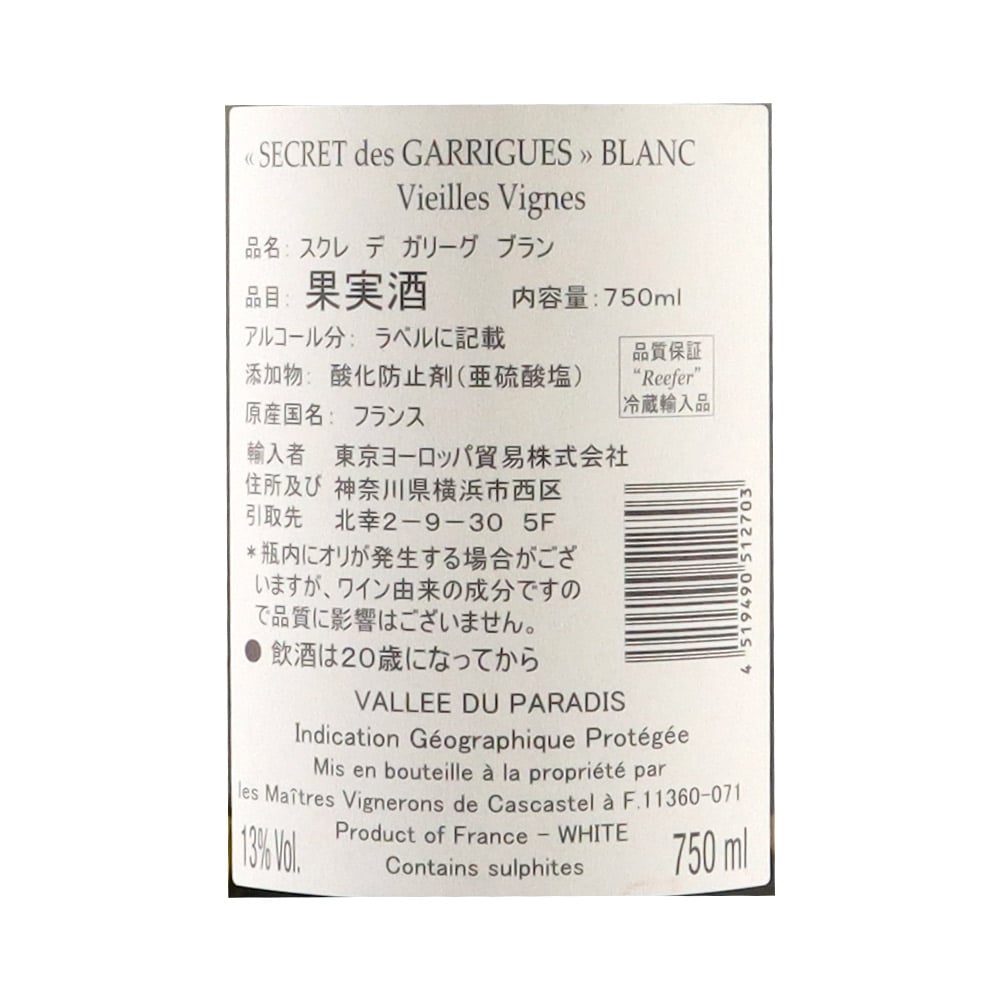 楽園の谷「バレー・ド・パラディ」で造られる。樹齢の高い南フランスのぶどうで、エキゾチックさも感じるフルーティな辛口ワインです。お料理と一緒に。
