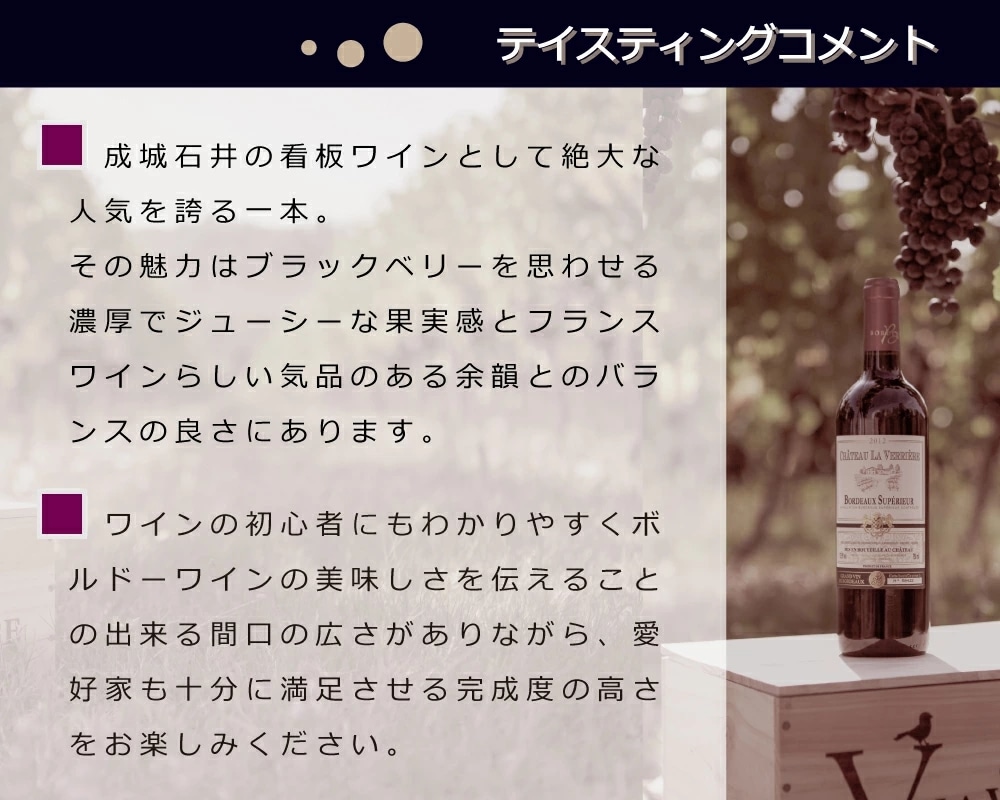 成城石井の看板ボルドー赤ワイン。豊かな果実の香りとまろやかでバランスの良い味わいが人気の秘密です。
