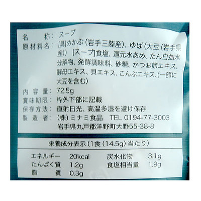 岩手県産大豆100%と天然水のみから作ったゆばと、適度な歯ごたえと磯の風味豊かな三陸めかぶを使用した、塩ベースのあっさりスープです。
