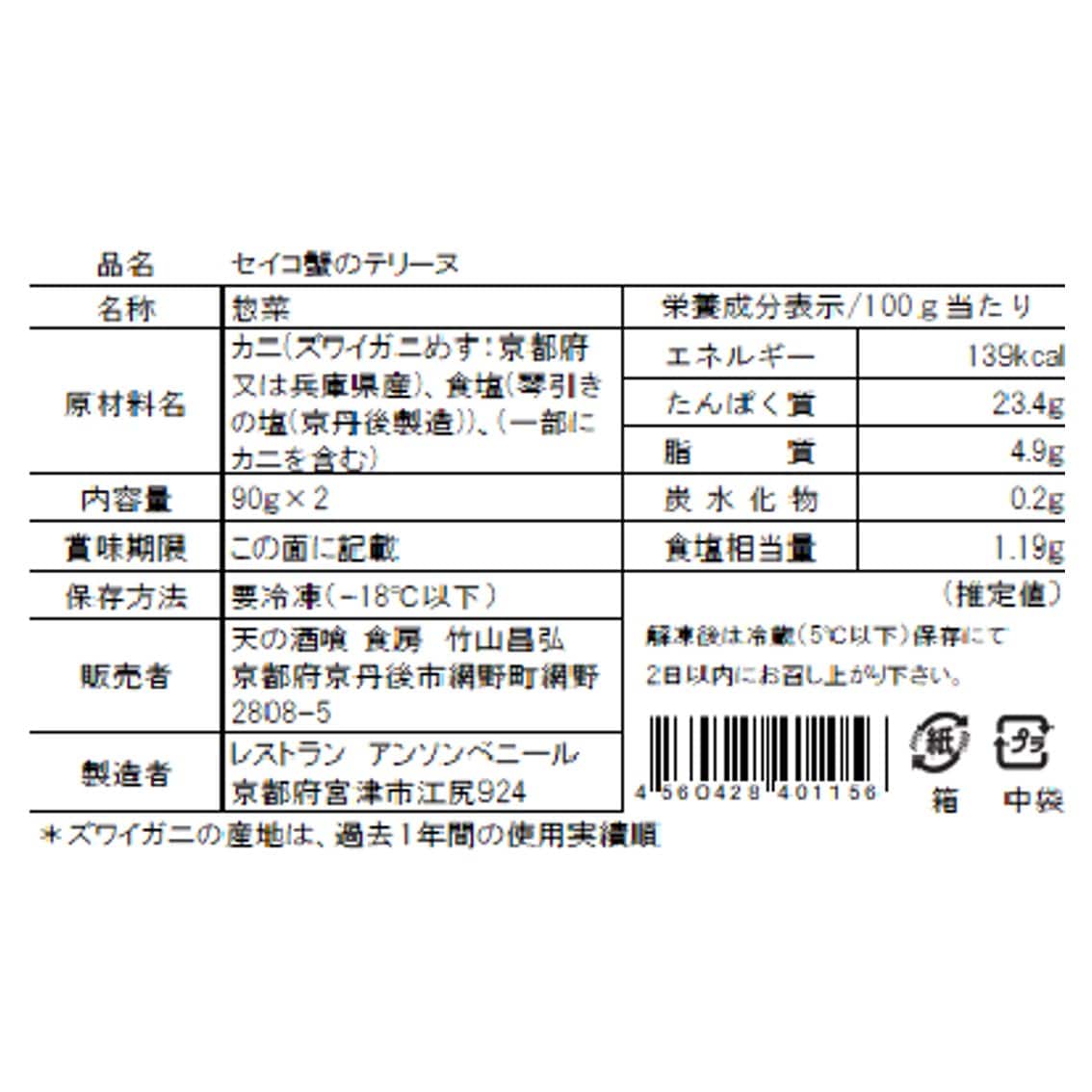 | 商品内容 | 天の酒喰食房 セイコ蟹のテリーヌ 90g×2 |
