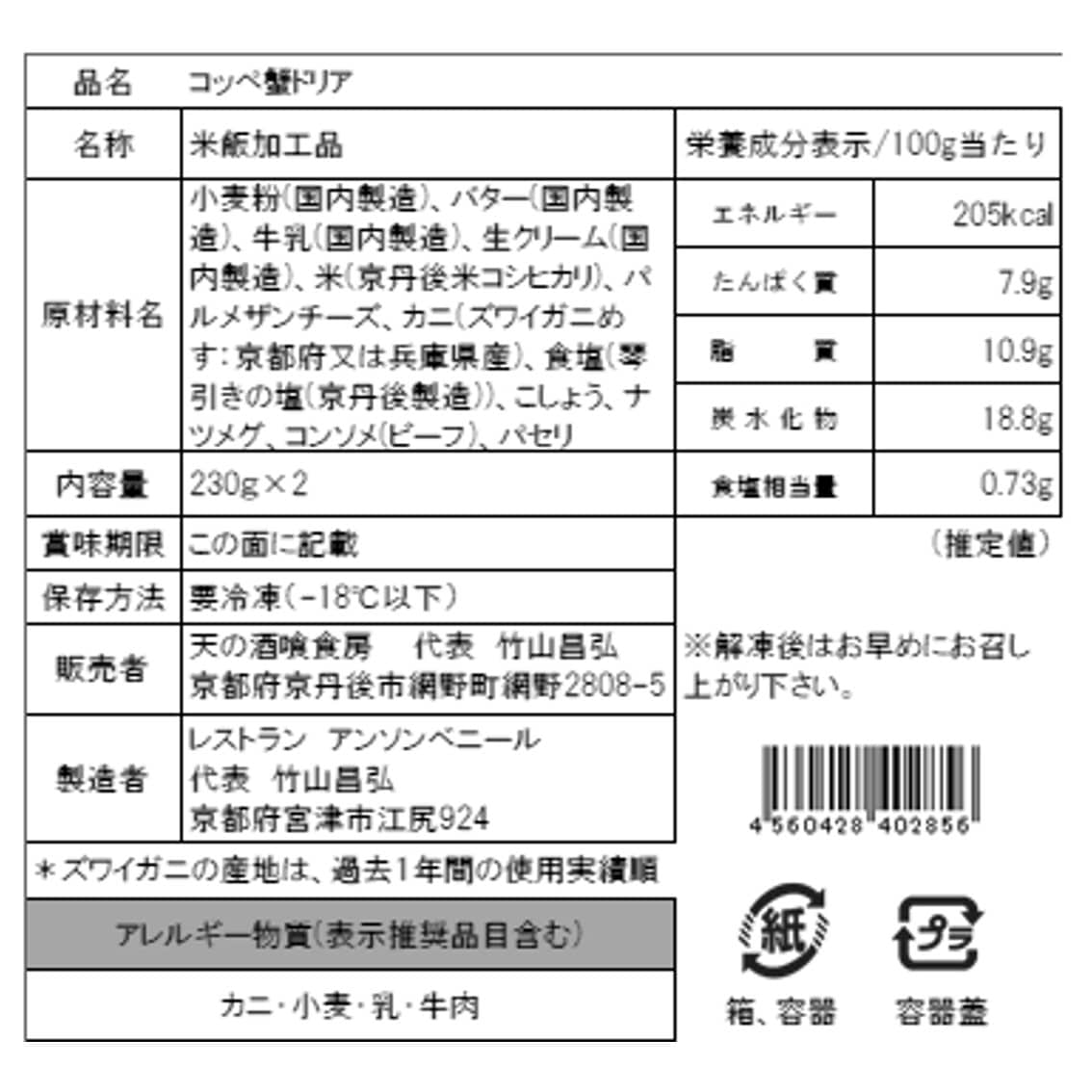 | 商品内容 | 天の酒喰食房 コッペ蟹ドリア 230g×2 |