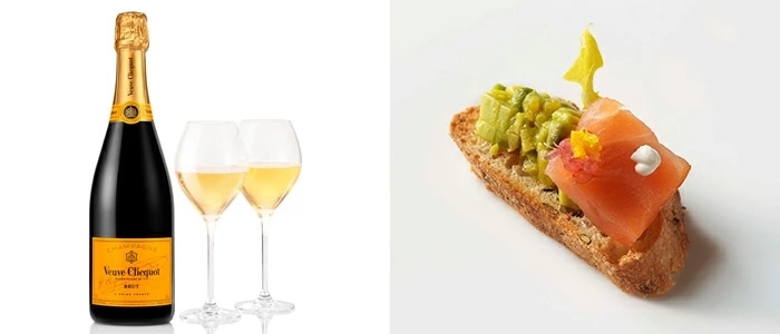 イエローラベルには、「力強さ」と「繊細さ」という、ふたつの相反する特徴がうまく調和しており、完璧なバランスを保っています。この不変の魅力により、理想的なアペリティフとなり、またお料理とともに楽しむことができます。特に、サーモンとアボカドのタルトなど、シーフード料理との相性は抜群です。