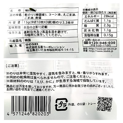 100%韓国産焼きのりです。小分け用パックだから簡単に取って食べられます。
