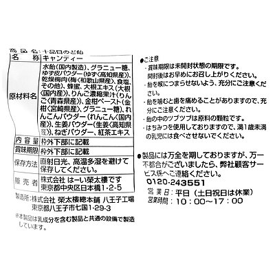 生姜、林檎、大根、柚子、蜂蜜、紅茶、梅、花梨、葱、金柑をバランスよく飴に混ぜ込んだ本格派のど飴です。