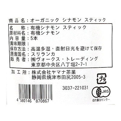 - > ヴォークススパイス 有機シナモンスティック(袋) 5本