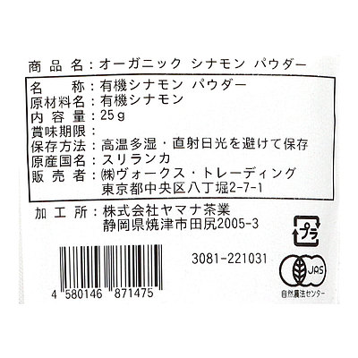 - > ヴォークススパイス 有機シナモンパウダー(袋) 25g