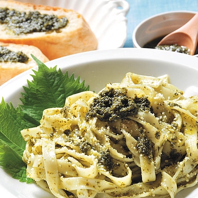 大分の植木農園にて、新芽のときにしか採れない大葉を手摘みし、加工して使用。スペイン産オリーブオイル、国産にんにく、国産唐辛子、食塩を加え、極力熱を加えず仕上げています。