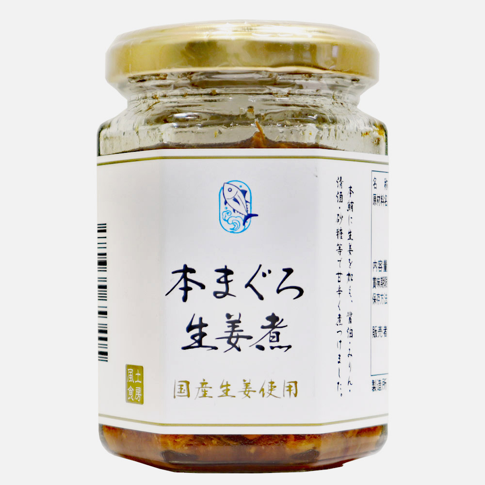 本鮪に生姜を加え、醤油、みりん、清酒、砂糖等で甘辛く煮つけました。魚醤が隠し味です。