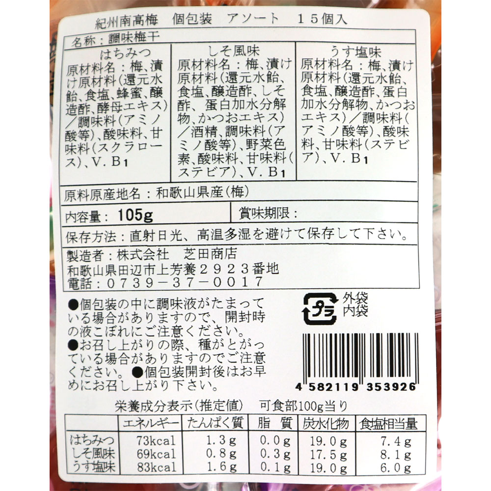 食べやすいサイズの紀州南高梅を1粒ずつ包装にし、はちみつ・しそ風味・うす塩味の3種類の味を一度に楽しめます。