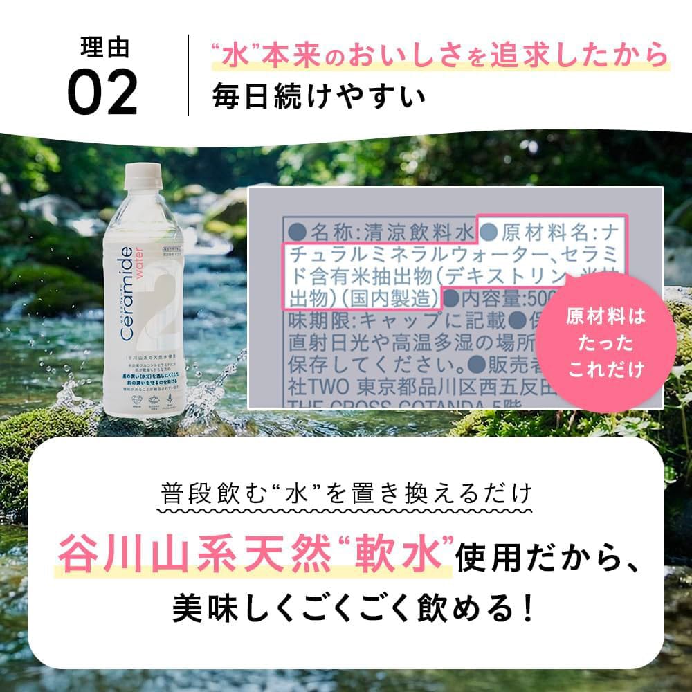 谷川山系の天然水に、肌の潤いを逃がしにくく、潤いを守ってくれる機能性成分「セラミド」を配合しました。