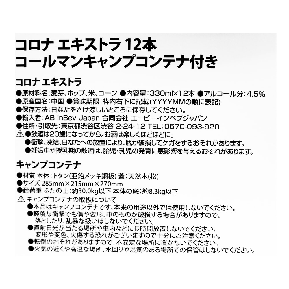 コロナとコールマンのコラボレーションによる専用コンテナ付き!コロナビール(瓶)330ml×12本入り。