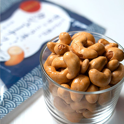 まろやかな醤油風味の甘から衣をまとったカリッと香ばしいカシューナッツです。