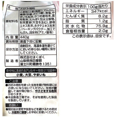 国内産の小麦粉使用のお好み焼き粉です。国内産かつお節、国内産昆布、国内産山芋粉を配合しています。
