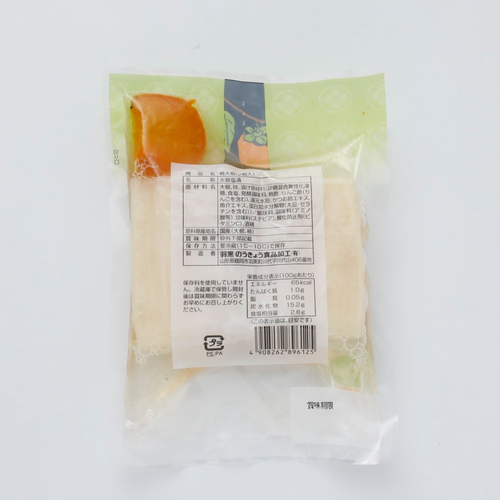 国産の大根を庄内柿の果肉と一緒に漬け込みました。果物感覚の浅漬けになります。