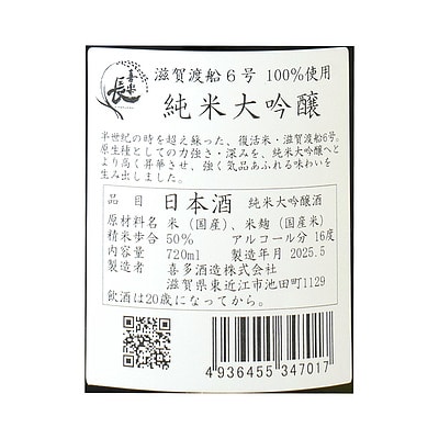 - > 滋賀 喜楽長 滋賀渡船6号 純米大吟醸 720ml