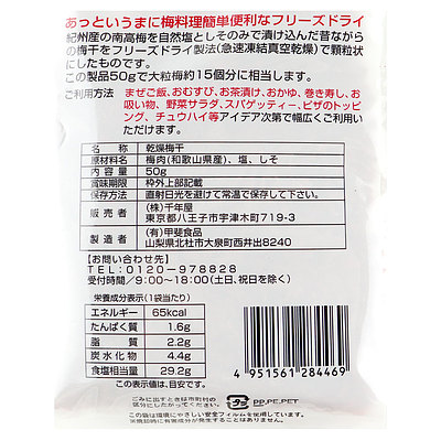 紀州産南紅梅を自然塩と紫蘇のみで漬込んだ梅干をフリーズドライ製法で顆粒状にしました。ご飯、おむすび、焼酎等に。