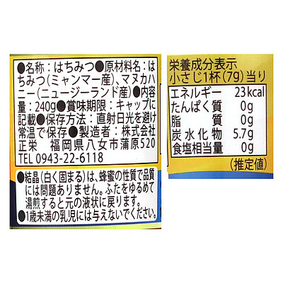ニュージーランド産マヌカハニーMGO100+を10%使用。ナツメやゴマ、ひまわりなどのミャンマー産の蜂蜜とブレンドしたコク深く濃厚な風味です。
