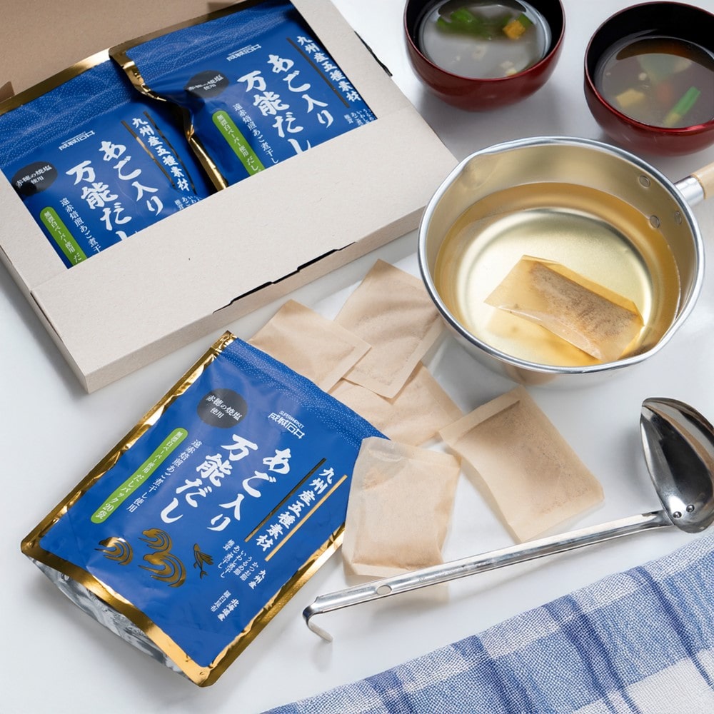 九州産五種の素材と北海道産羅臼昆布をバランス良く配合した味付だしパックです。赤穂の焼塩使用。