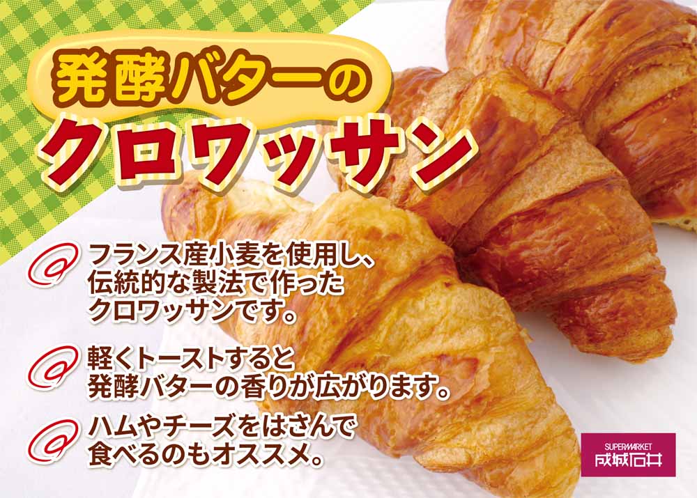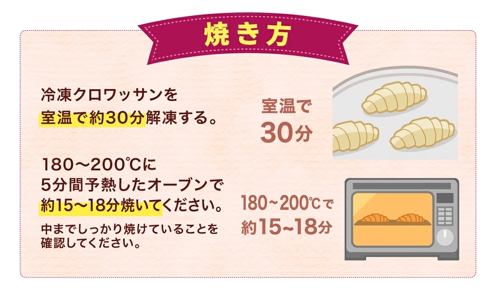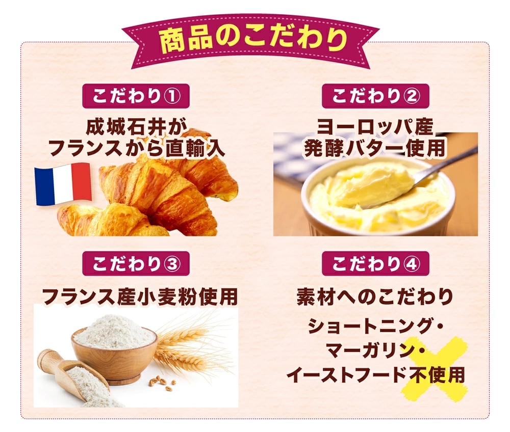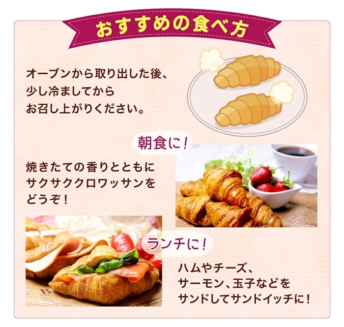 フランス産小麦粉とヨーロッパ産発酵バターを使用。焼き立ては発酵バターの香りが引き立ち、生地もサクサク。手軽に焼き立てパンが楽しめます。