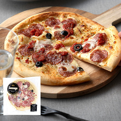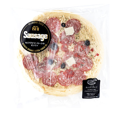 こんがりとした焼き色のナポリ風フチ付きクラストに、セミドライソーセージやモッツァレラチーズ、パルミジャーノレジャーノなどをトッピングしました。