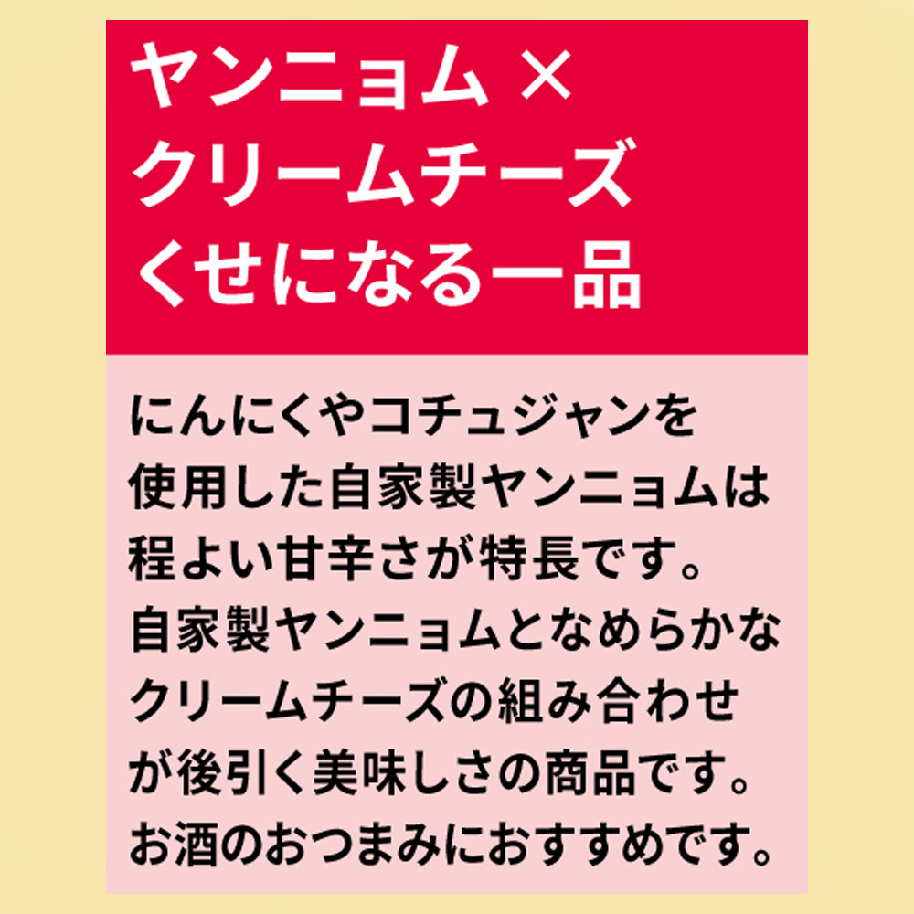 にんにくやコチュジャンなどを使用した自家製ヤンニョムとクリームチーズを合わせました。辛味とチーズのまろやかさが癖になる一品です。