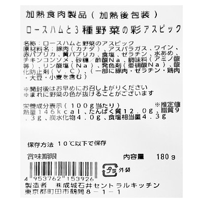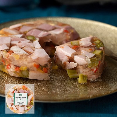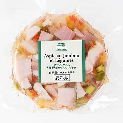 自家製ロースハムとアスパラと赤・黄色のパプリカをゼリーで冷やし固めました。色合いが鮮やかで、食卓を華やかに演出します。