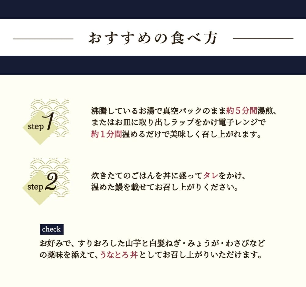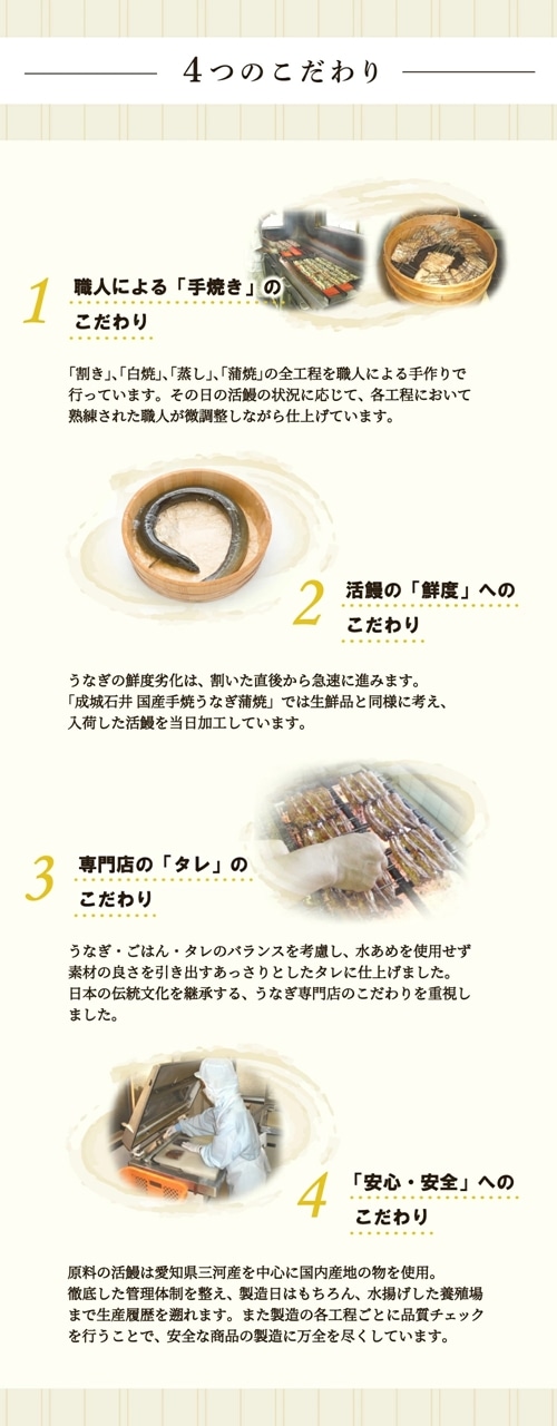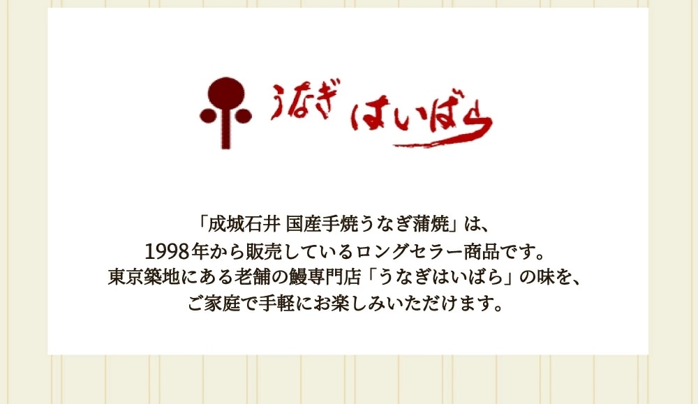 <タレ・山椒付>江戸時代後期、江戸中に人気が広まったうな丼定番規格に国内産活鰻を使用し、職人が1枚1枚手焼きで仕上げ、真空パックにしました。愛知産うなぎ使用。