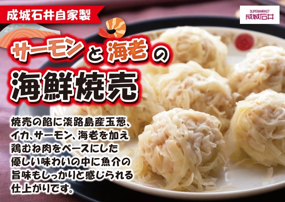 鶏むね肉をベースに、サーモントラウト、イカ、海老を生地に入れた焼売です。干し貝柱、干し海老でさらに旨味を加えています。