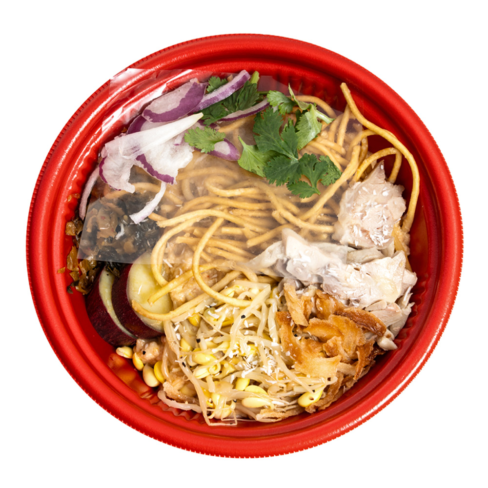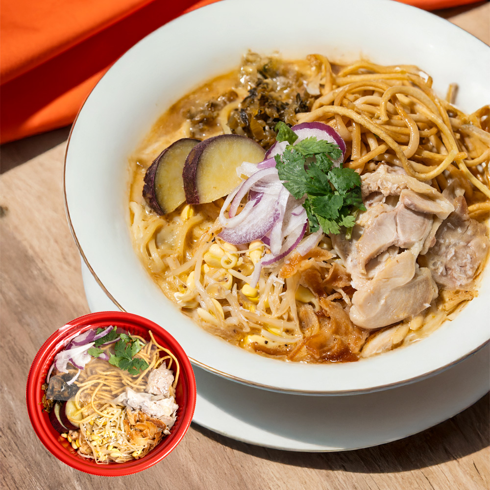 ココナッツクリームの濃厚さと2種のカレーペースト、ナンプラー等の深いコクが特長のスープです。自家製の中華麺を茹でと揚げの2つの食感で楽しめるこだわりの味わいをお楽しみください。