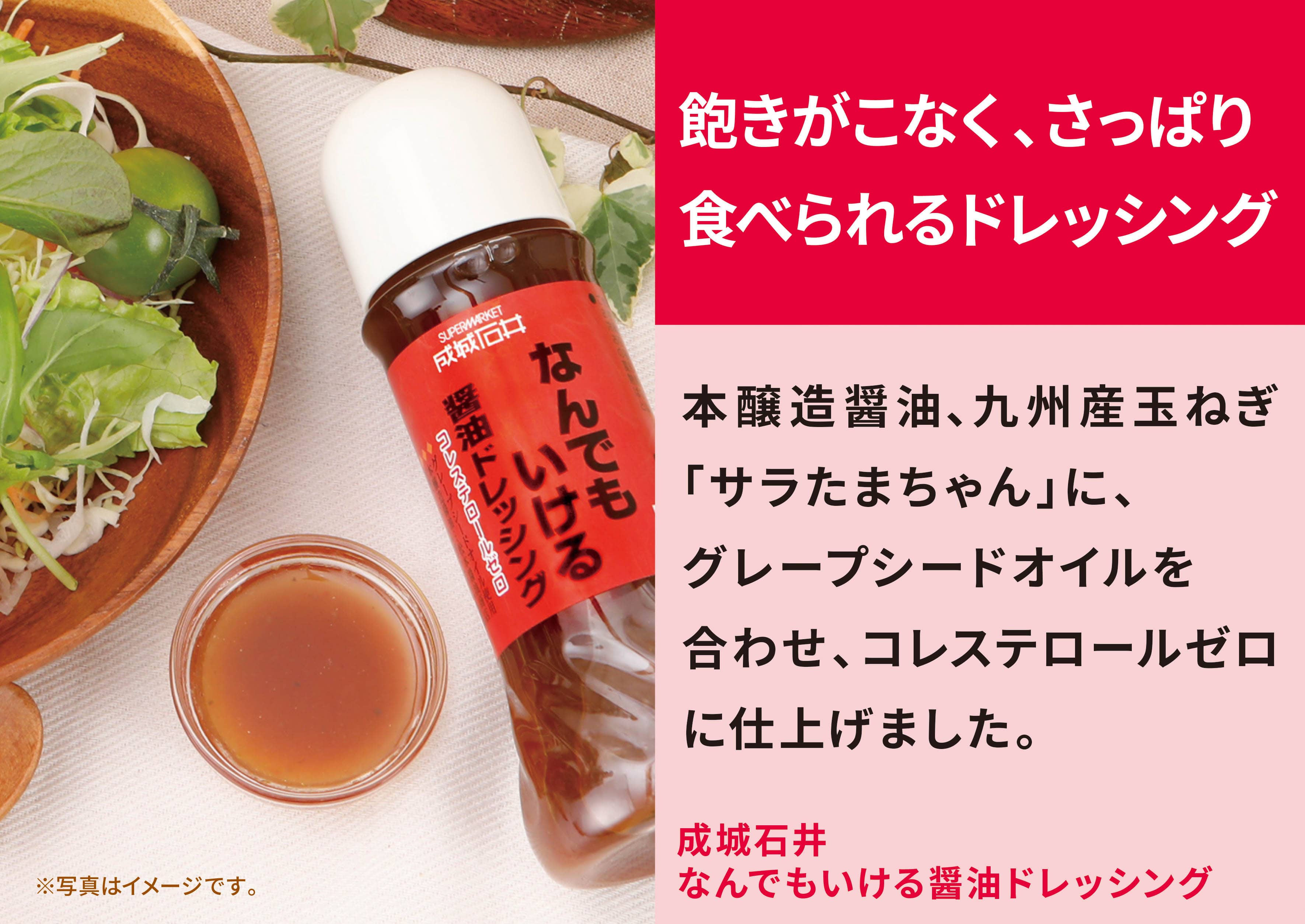本醸造醤油、九州産玉ねぎ「サラたまちゃん」に、グレープシードオイルを合わせ、コレステロールゼロに仕上げました。