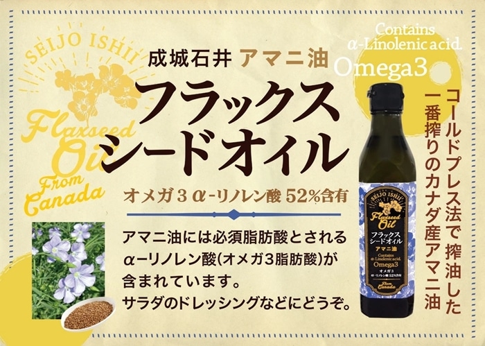 必須脂肪酸とされるαーリノレン酸が含まれているオイル。コールドプレス法で搾油し、精製してにおいやえぐみを感じにくくしました。熱に弱いので、料理の仕上げにお使いください。