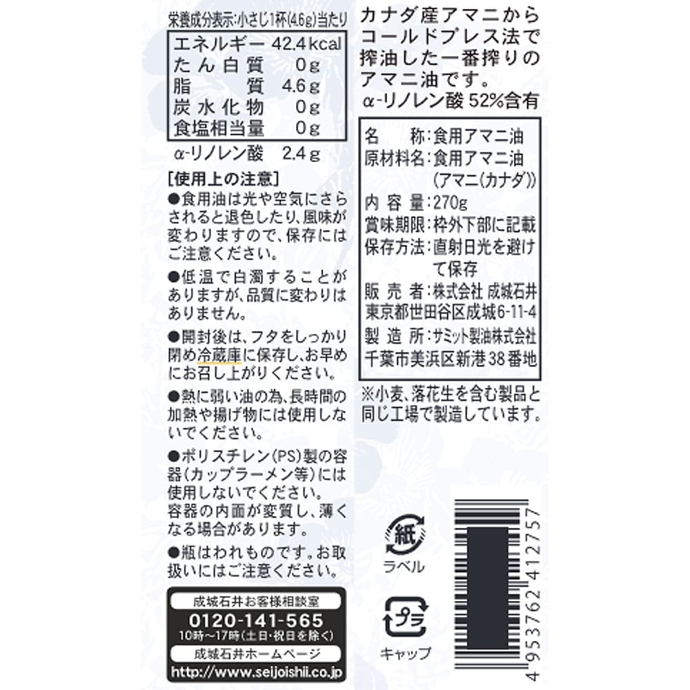 - > 【送料込み】成城石井カナダ産アマニ油 270g×3本