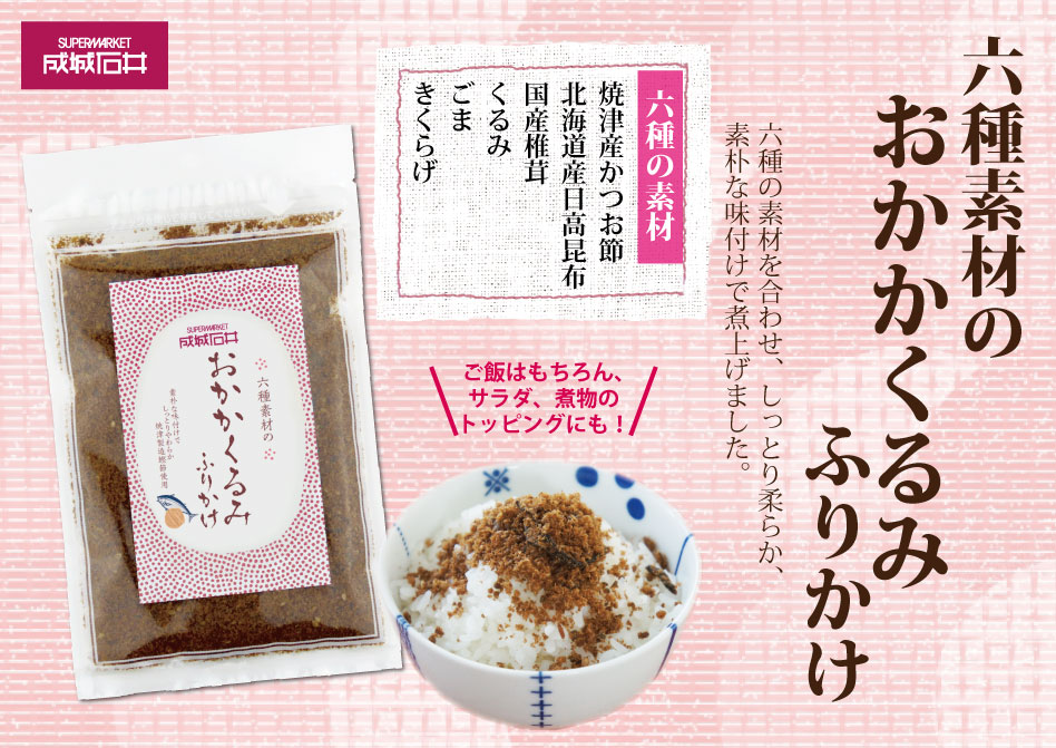 6種の素材を合わせたしっとりやわらかなふりかけです。焼津産鰹節、日高昆布、国産椎茸のコクのある旨味と、くるみ、ごま、きくらげの食感をお楽しみください。