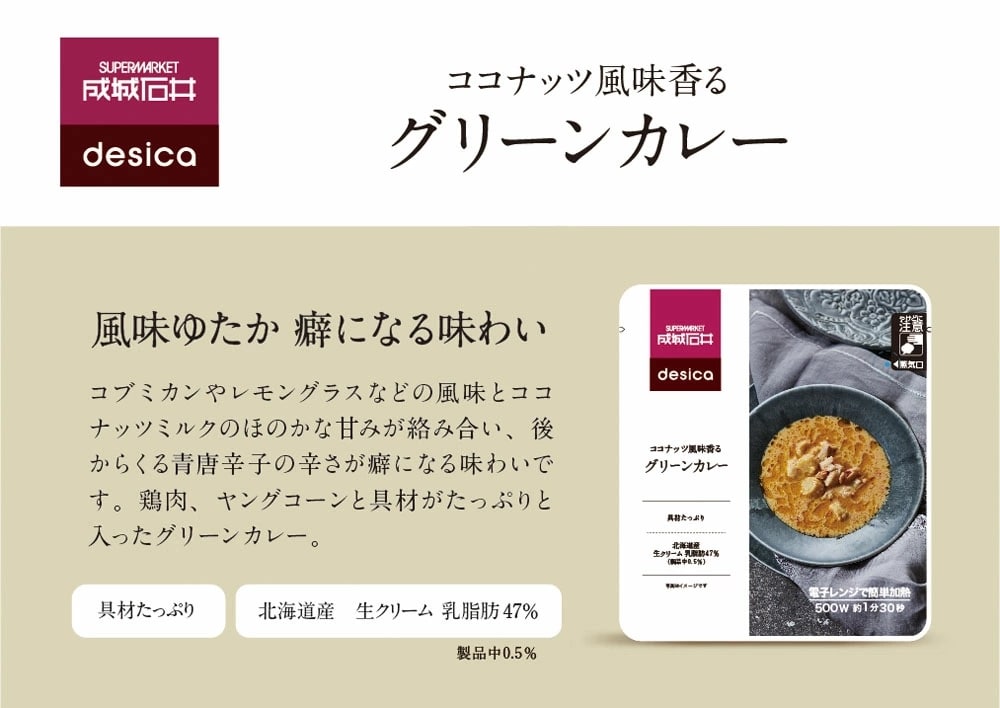 ココナッツミルクのほのかな甘みに、後からくる青唐辛子の辛さが癖になる味わい。鶏肉、ヤングコーンと具材がたっぷりと入ったグリーンカレー。