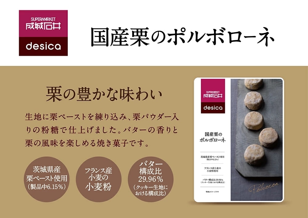 茨城県産の栗ペーストを練り込み焼き上げた生地に、栗パウダーを混ぜた粉糖をまぶしました。栗の優しい甘さと風味をお楽しみいただけます。