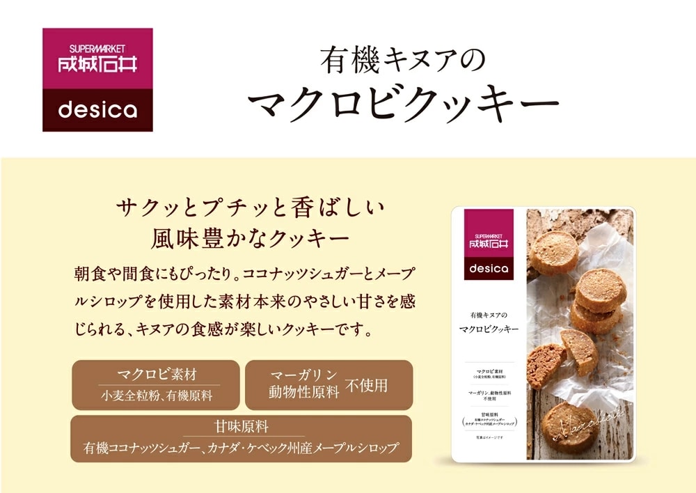 小麦全粒粉やココナッツシュガーで風味豊かな自然な甘さ。プチッとした食感がアクセント。