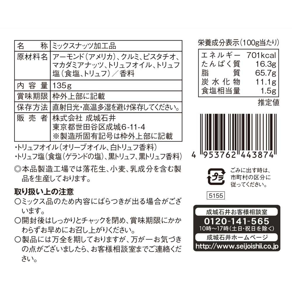 - > 成城石井 2種のトリュフ香るミックスナッツ 【プレミアム】135g