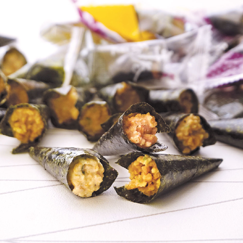 国産の海苔を巻寿司風に形作り、国産大豆を使った乾燥納豆とあられを詰めたおつまみあられです。プレーン、紀州梅味、チーズ味の3種の味わいの詰め合わせ。