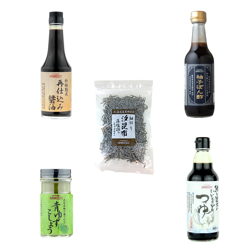| 商品内容 | 成城石井 鰹と昆布のいいとこどりつゆ×1 成城石井 高知県香り美市産ゆず果汁使用 柚子ポン酢×1 成城石井 杉桶熟成 再仕込み醤油×1 成城石井 北海道産昆布使用細切り×1 |