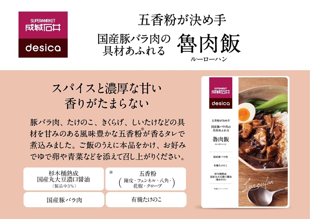 豚バラ肉、たけのこ、きくらげ、しいたけなどの具材を甘みのある風味豊かな五香粉が香るタレで煮込みました。