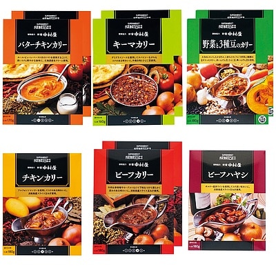 | 商品内容 | バターチキンカリー170g×2 キーマカリー160g×2 野菜と3種豆のカリー180g×2 チキンカリー180g×1 ビーフカリー180g×2 ビーフハヤシ180g×1 |