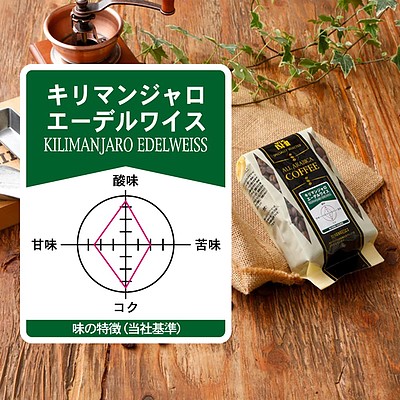 タンザニア最高峰キリマンジャロ西部に位置するエーデルワイス農園は、標高が高く肥沃な土壌と降雨量の豊富さというコーヒー豆栽培に適した条件の下で生産しています。フルーティーな甘味と、心地よい酸味が特徴です。