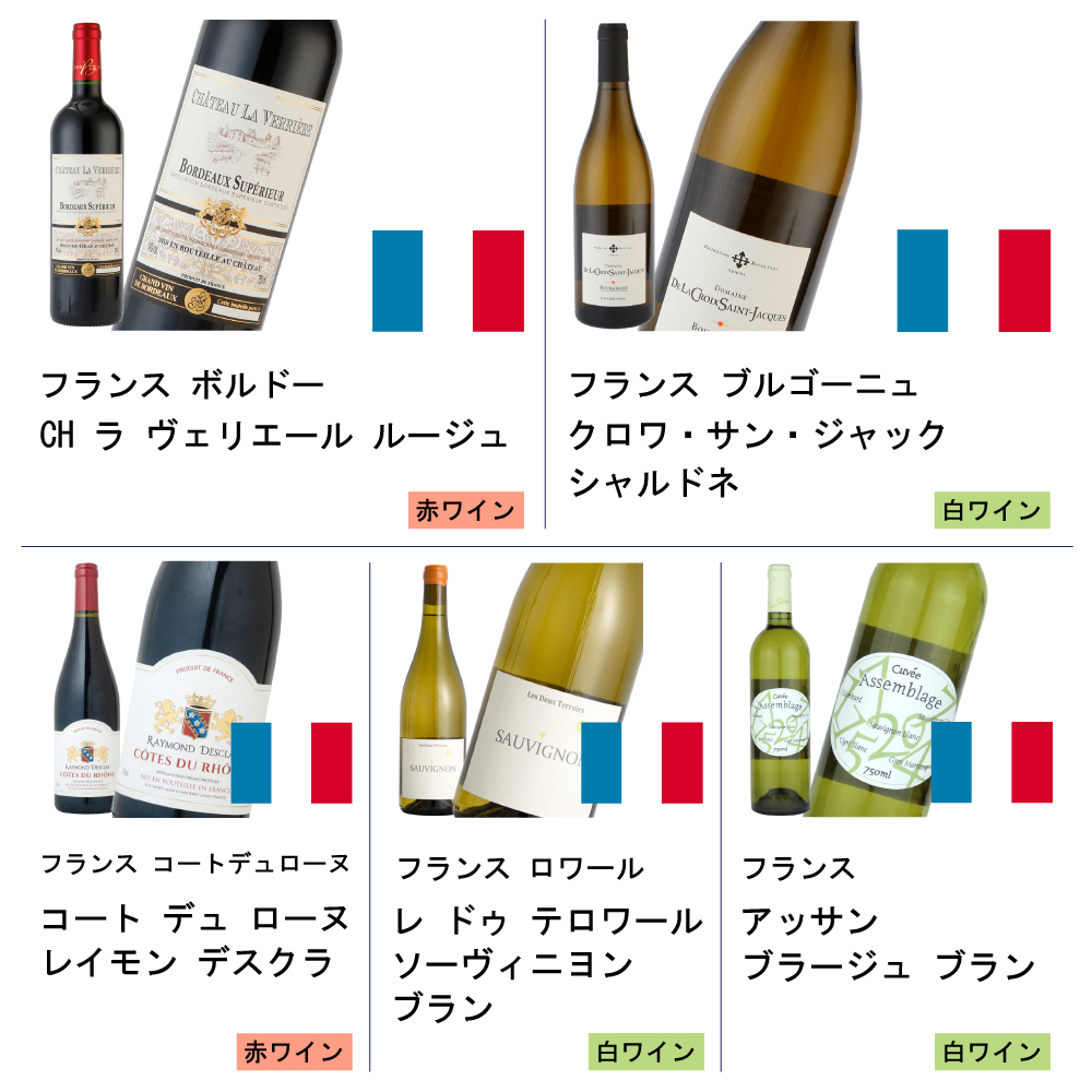 ボルドー、ブルゴーニュ、コートデュローヌ、ロワール、南西地区の5つの産地の赤・白ワインを楽しめるセットです。