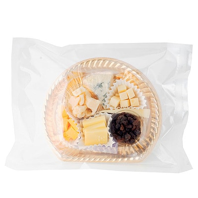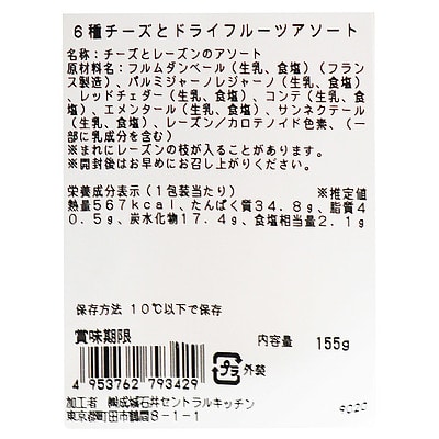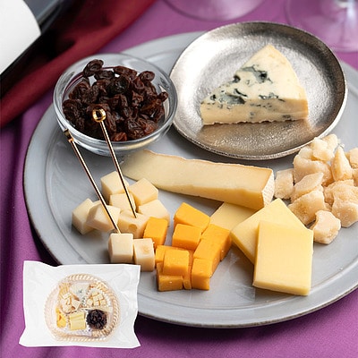 フルムダンベール、サンネクテール、エメンタール、パルミジャーノレジャーノ、レッドチェダー、コンテとレーズンの詰め合わせ。