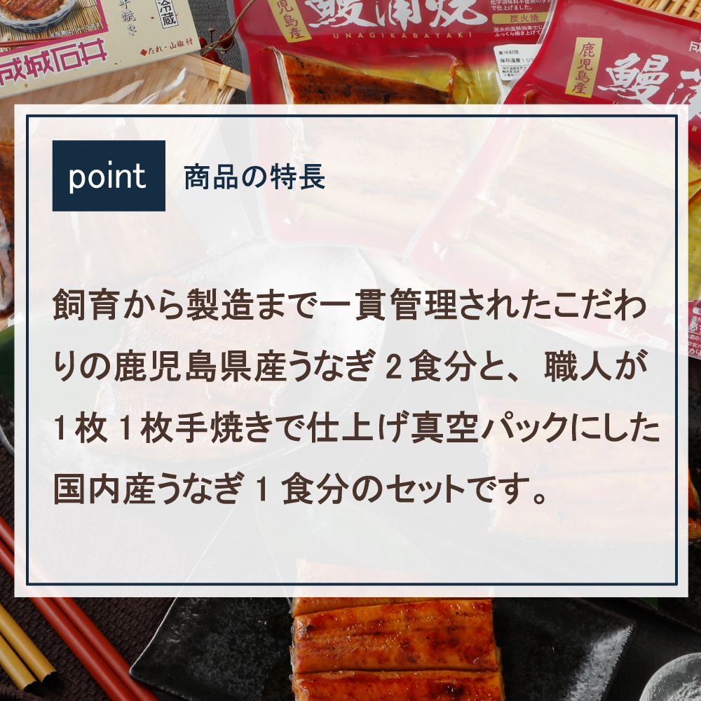 飼育から製造まで一貫管理されたこだわりの鹿児島県産うなぎ2食分と、職人が1枚1枚手焼きで仕上げ真空パックにした国内産うなぎ1食分のセットです。