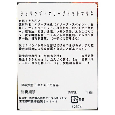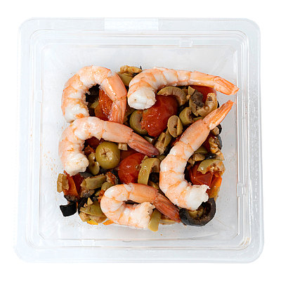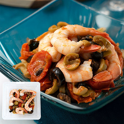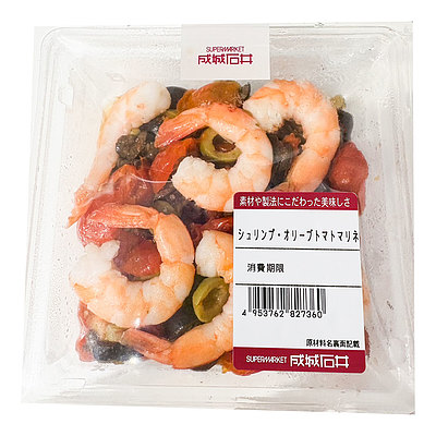 セミドライチェリートマトと2種オリーブを使用したスペインのタパス風マリネに海老をトッピング。よく混ぜてお召し上がりください。
