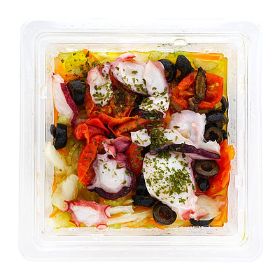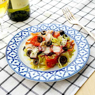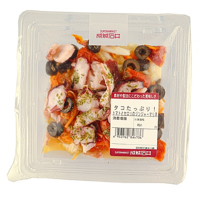 生姜がアクセントのさわやかなセロリマリネに自家製キャロットラペを加え、タコ、チェリートマト、ブラックオリーブをトッピング