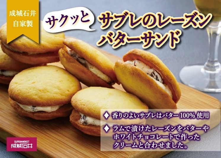 バターの香り豊かなサクッとした食感のサブレでラム酒に漬け込んだレーズン入りのクリームを挟みました。_
