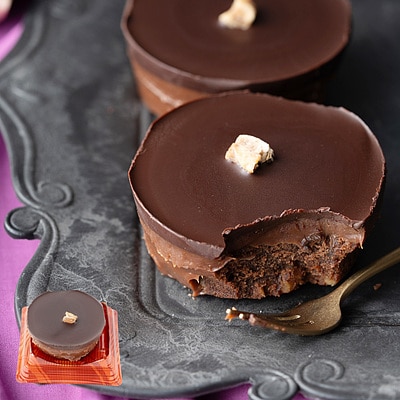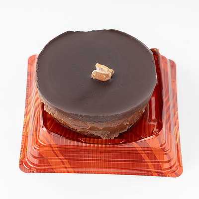 カカオ66%クーベルチュールチョコレートを使用したブラウニー生地に自家製キャラメルとミルクチョコレートを使用したキャラメルガナッシュを重ねました。無花果のプチプチ食感がアクセント。
