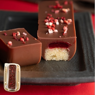 チョコレートの味わいと羊羹の要素を両方引き出しました。フランボワーズの酸味で食べ飽きずお召し上がりいただけます。_